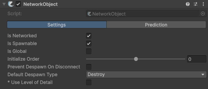 > This should be used to set whether the object is making use of [prediction](https://fish-networking.gitbook.io/docs/guides/features/prediction/what-is-client-side-prediction) or not. Enabling this will make available the following settings: