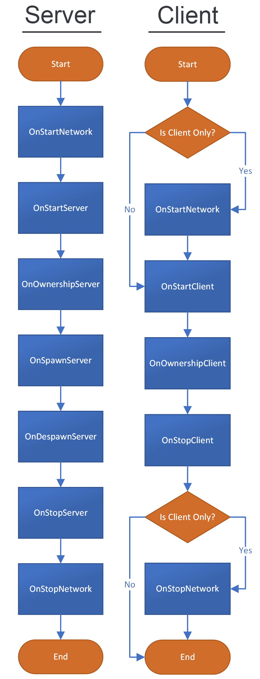 Next are the client callbacks. These callbacks will always occur after the server callbacks, even when acting as host. For example, a callback sequence might look like this: OnStartServer, OnOwnershipServer, OnSpawnServer, OnStartClient, OnOwnershipClient.