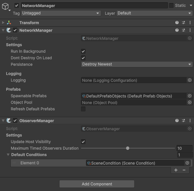 Finally, add an [ObserverManager component](https://fish-networking.gitbook.io/docs/fishnet-building-blocks/components/managers/observermanager) and in the **Default Conditions** field, add a new element and select the [SceneCondition](https://fish-networking.gitbook.io/docs/fishnet-building-blocks/scriptableobjects/observerconditions/scenecondition).