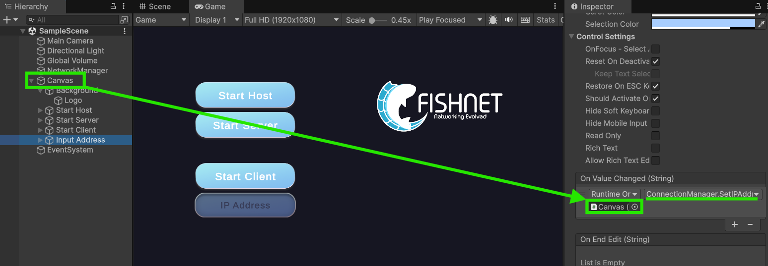 For the IP Address Input Field, you can hook up the **On Value Changed** event to the `ConnectionManager.SetIPAddress` method we created.