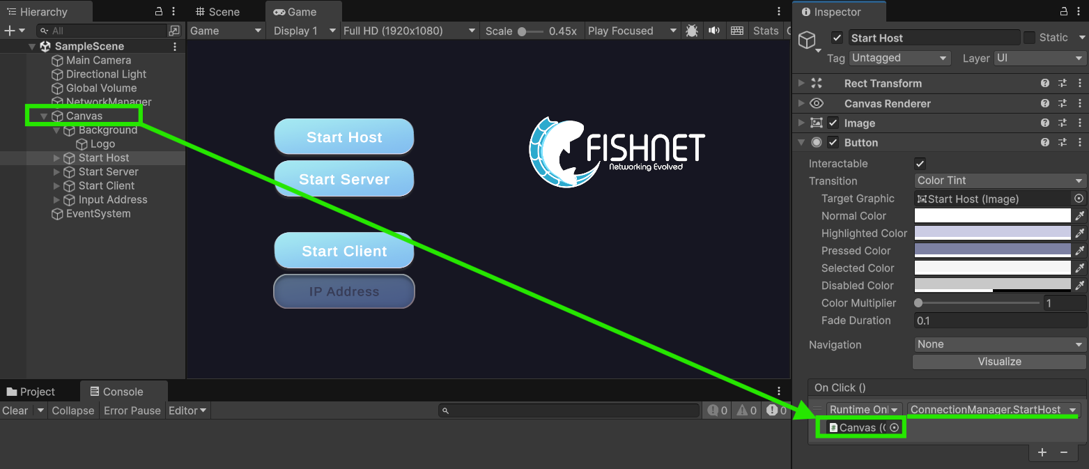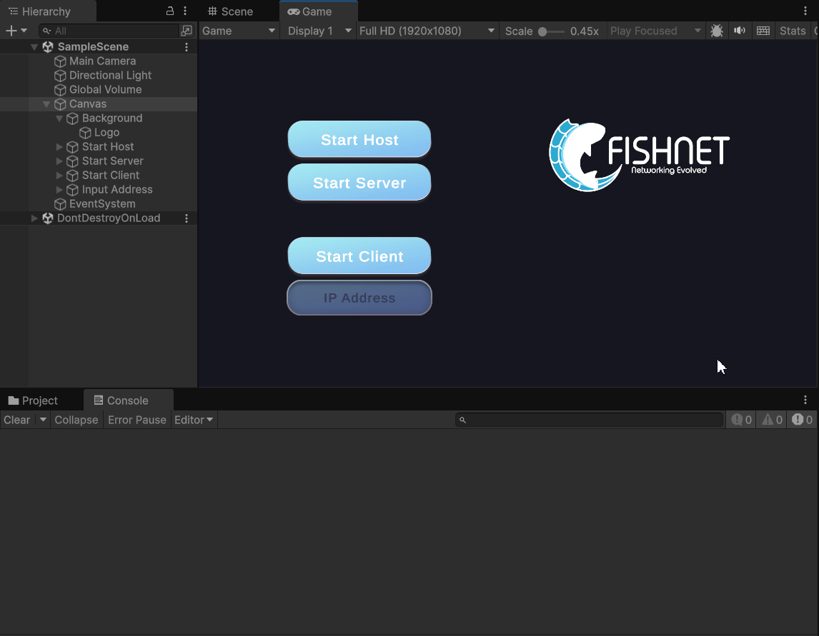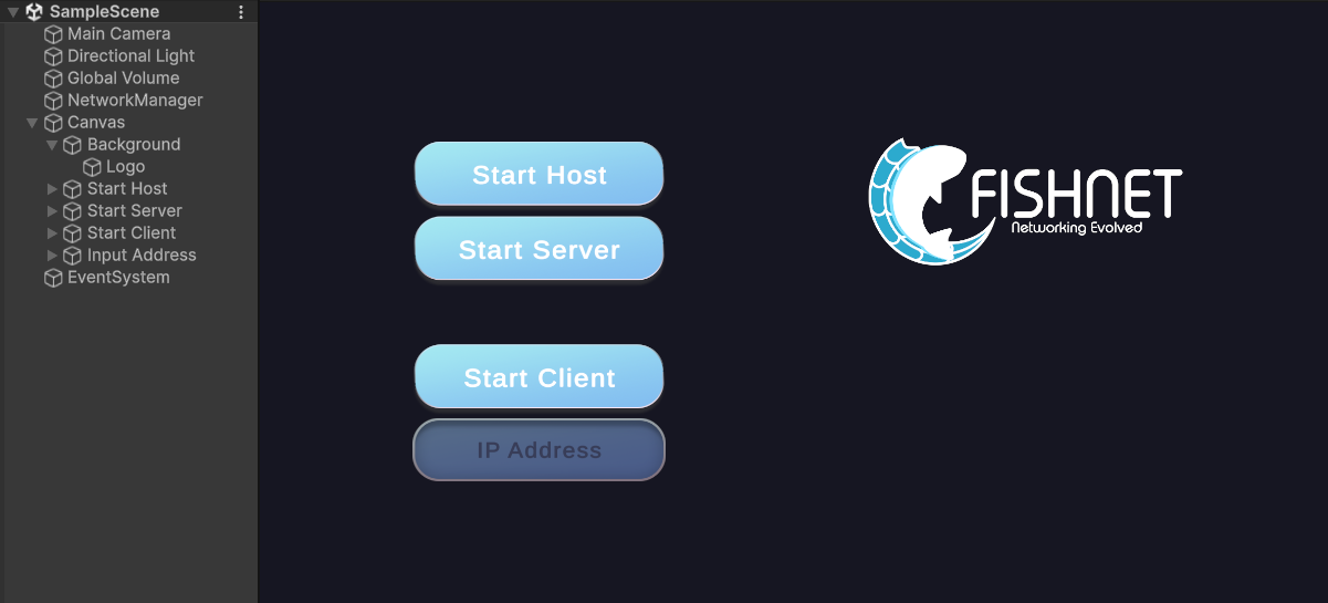 To get started, let's add a basic user interface which we can use to start the FishNet server, client, and allow the user to enter an IP Address to connect to.