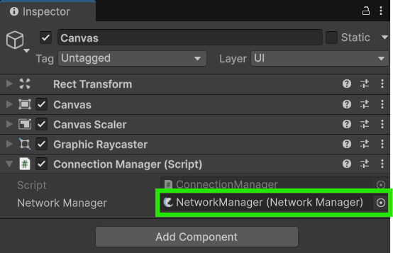Our **ConnectionManager** needs a reference to the NetworkManager component, assign that in the editor now.